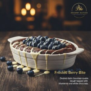 Desired dark chocolate cookie dough topped with blue berries and white chocolate.
