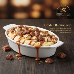 Tempting white chocolate cookie dough topped with kinder bueno and bueno sauce.