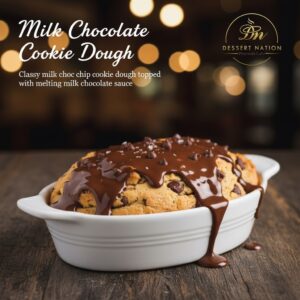 Classy milk choc chip cookie dough topped with melting milk chocolate sauce.