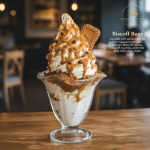 Layered soft serve ice cream topped with Biscoff sauce, Biscoff crumbs, and milk choc chips.
