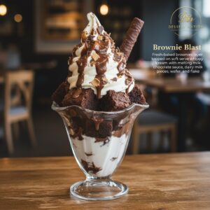 Fresh-baked brownies layer topped on soft serve whippy ice cream with melting milk chocolate sauce, dairy milk pieces, wafer, and flake.