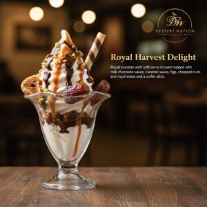 Royal sundae with soft serve ice cream topped with milk chocolate sauce, caramel sauce, figs, chopped nuts and royal dates and a wafer stick.