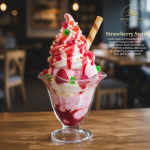 Fresh layered strawberry ice cream mixed with soft serve, fresh strawberry pieces, delicious strawberry puree and tutti fruit jellies and wafer.