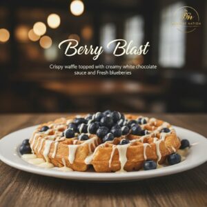 Crispy waffle topped with creamy white chocolate sauce and Fresh blueberries.