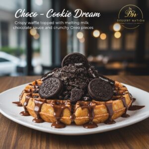 Crispy waffle topped with melting milk chocolate sauce and crunchy Oreo pieces.