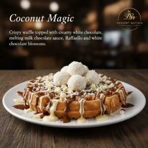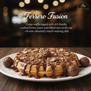 Crispy waffle topped with rich Nutella, crushed Ferrero pieces and nibbed nuts on the top oh wow absolutely mouth-watering dish.