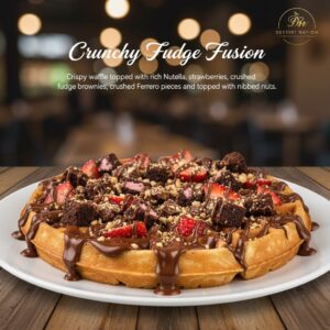 Crispy waffle topped with rich Nutella, strawberries, fudge brownies, crushed Ferrero pieces and topped with nibbed nuts.