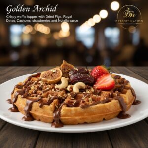Crispy waffle topped with Figs, Royal Dates, Cashews, strawberries and Nutella sauce.