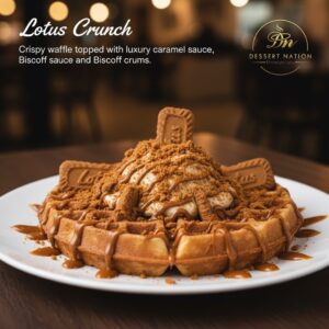 Crispy waffle topped with luxury caramel sauce, Biscoff sauce and Biscoff crumbs.