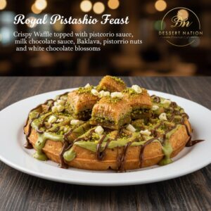 Crispywaffle topped with pistachio sauce, milk chocolate sauce, Baklava, pistachio nuts and white chocolate blossoms