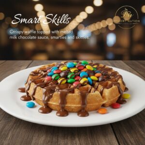 Crispy waffle topped with melted milk chocolate sauce, smarties and skittles.