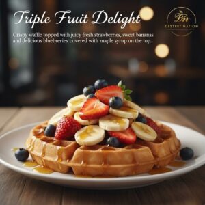 Crispy waffle topped with juicy fresh strawberries, sweet bananas and delicious blueberries cover with maple syrup on the top.