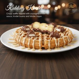 Crispy waffle topped with courage's kinder sauce, kinder bueno and kinder hippo